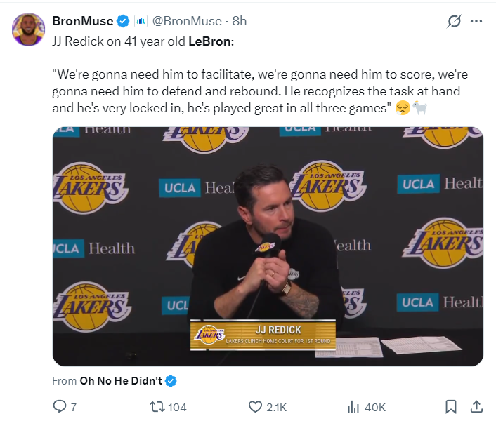 雷迪克评价单核勒布朗:我们需要他来组织进攻,我们还需要他得分,我们更需要他的防守与抢篮板,他很清楚自己手头的任务有多重,而且全身心的投入其中,他在过去三场比赛单核表现都非常出色。