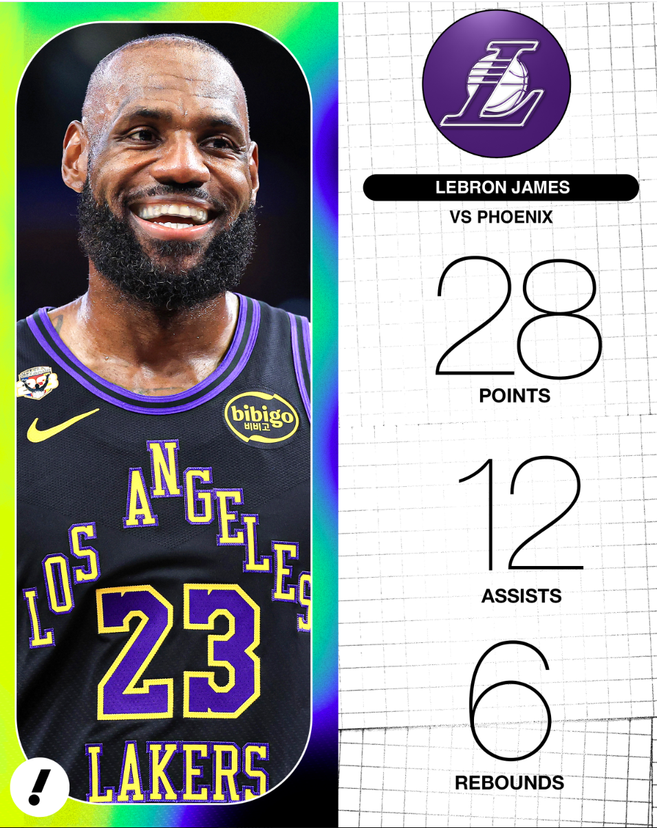 勒布朗过去三场比赛都至少拿到25+10助攻,他成为NBA历史上首位40岁以上连续三场比赛25+10助攻的球员,这位老将本赛季已经第17次助攻上双了,我们就坐等看这位41岁的老将在季后赛首轮的单核表现了。