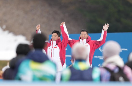 3月10日,亚军中国选手余爽和引导员尚金财(右)在颁奖仪式上。新华社记者 侯昭康 摄