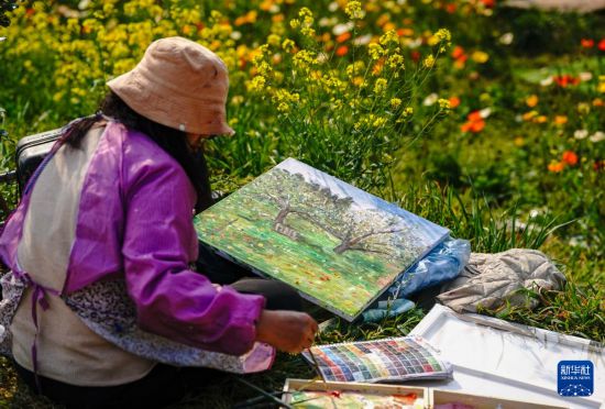 3月10日,一名油画爱好者在昆明名花谷写生。